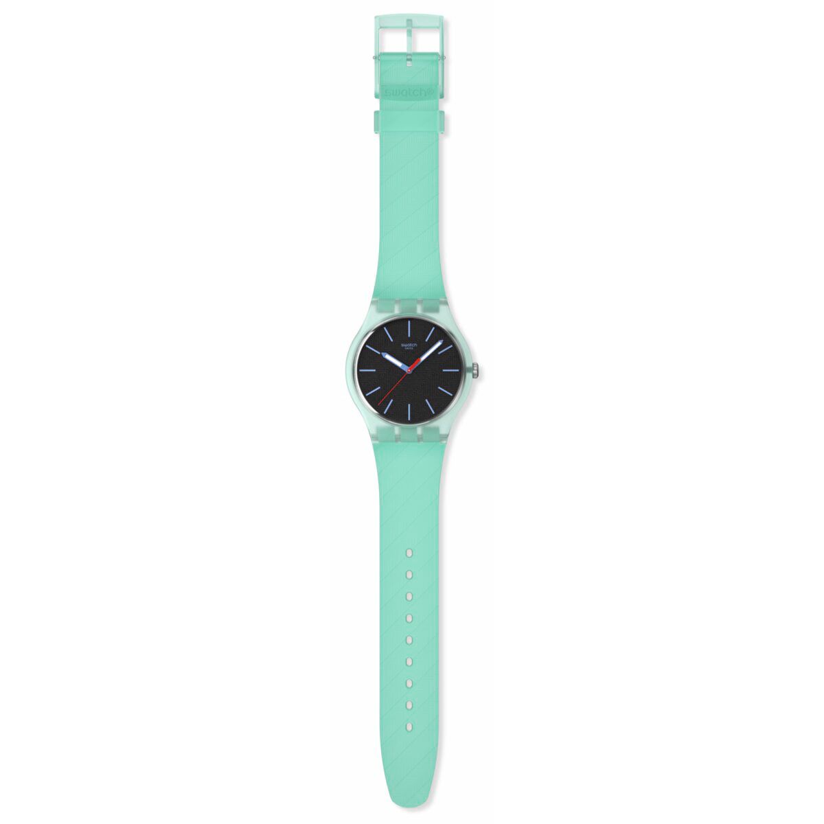 ライトブループリントのインデックス、暗闇で光る効果のあるライトブルーの時針と分針、レッドの秒針を備えた、テクスチャーのあるブラックの文字盤と、透明なマットライトグリーンのバイオ由来素材ケースおよびバイオ由来素材グラスが特徴です。マットライトグリーンのループと透明なマットライトグリーンのバックル付きのテクスチャー加工されたマットライトグリーンのストラップで仕上げられています。