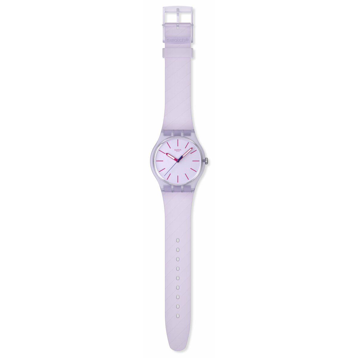 ダークピンクプリントのインデックス、暗闇で光る効果のあるダークピンクの時針と分針、ブルーの秒針を備えた、テクスチャーのあるライトパープルの文字盤と、透明なマットライトパープルのバイオ由来素材ケースおよびバイオ由来素材グラスが特徴です。透明なマットライトパープルのループと、バックル付きのテクスチャー加工されたマットライトパープルのストラップで仕上げられています。