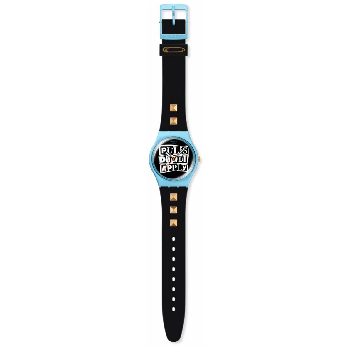 「Rules do not apply」(ルールは適用されない)とホワイトプリントされたブラックの文字盤が特長。暗闇で光る効果のブラックの時針と分針、そしてオレンジの秒針が時刻を示し、バイオ由来素材グラスでカバーされています。マットライトブルーBioceramic製ケースには、ゴールドカラーのスタッズが付いたマットブラックのストラップ、ゴールドカラーの安全ピンデザインがプリントされたマットブラックのループ、そしてマットライトブルーのBioceramic製バックルが組み合わせられています。