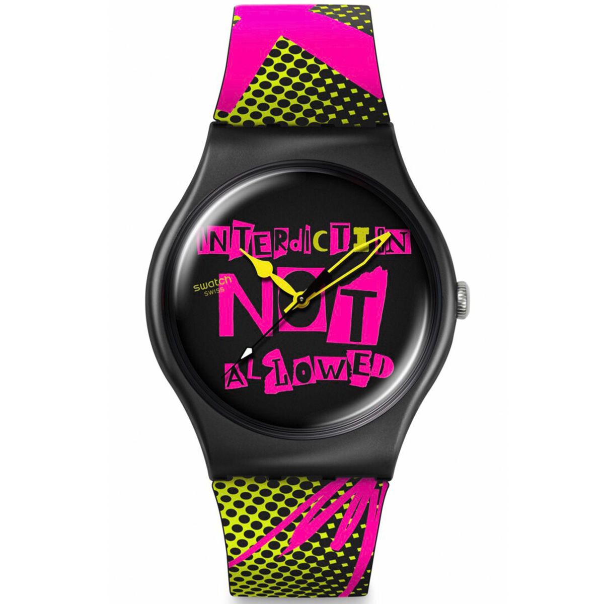 「Interdiction not allowed」(禁止は許されない)とマルチカラーでプリントされたブラックの文字盤が特長。異なる形のイエローの時針と分針、暗闇で光る効果が施されたブラックの秒針が時刻を示し、バイオ由来素材グラスでカバーされています。マットブラックの Bioceramicケースに、マルチカラーのプリントが施されたマットブラックのストラップ、マットブラックのループ、そしてマットブラックのBioceramic製バックルが組み合わせられています。