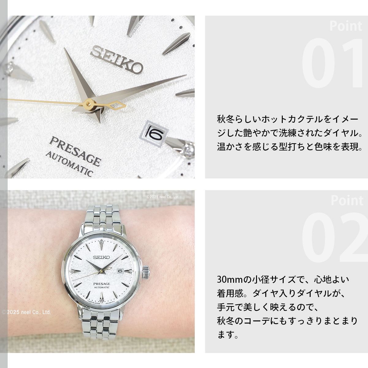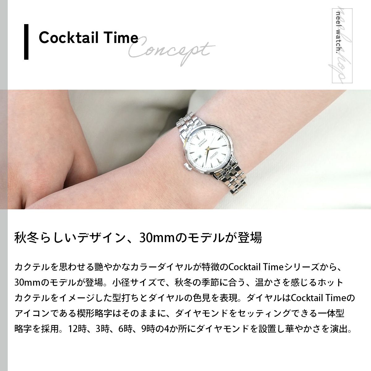 カクテルを思わせる艷やかなカラーダイヤルが特徴のCocktail Timeシリーズから、秋冬らしいホットカクテルをイメージした30mmのモデルが登場。30mmの小径サイズで、秋冬の季節に合う、温かさを感じるホットカクテルをイメージした型打ちとダイヤルの色見を表現。ダイヤルはCocktail Timeのアイコンである楔形略字はそのままにダイヤモンドをセッティングできる一体型略字を採用。12時、3時、6時、9時の4か所にダイヤモンドを設置し華やかさを演出。
