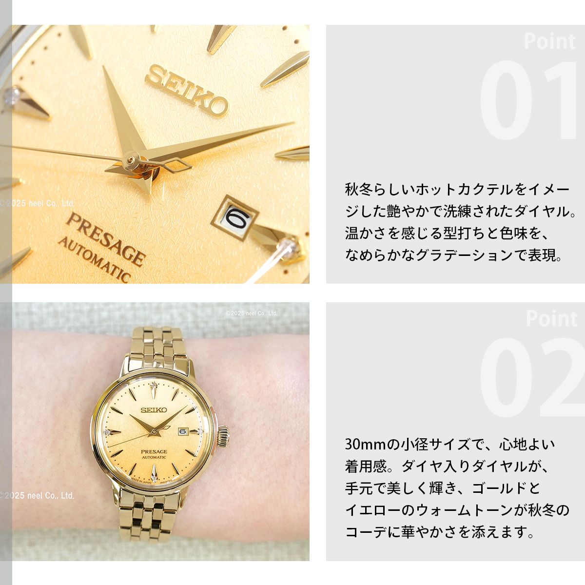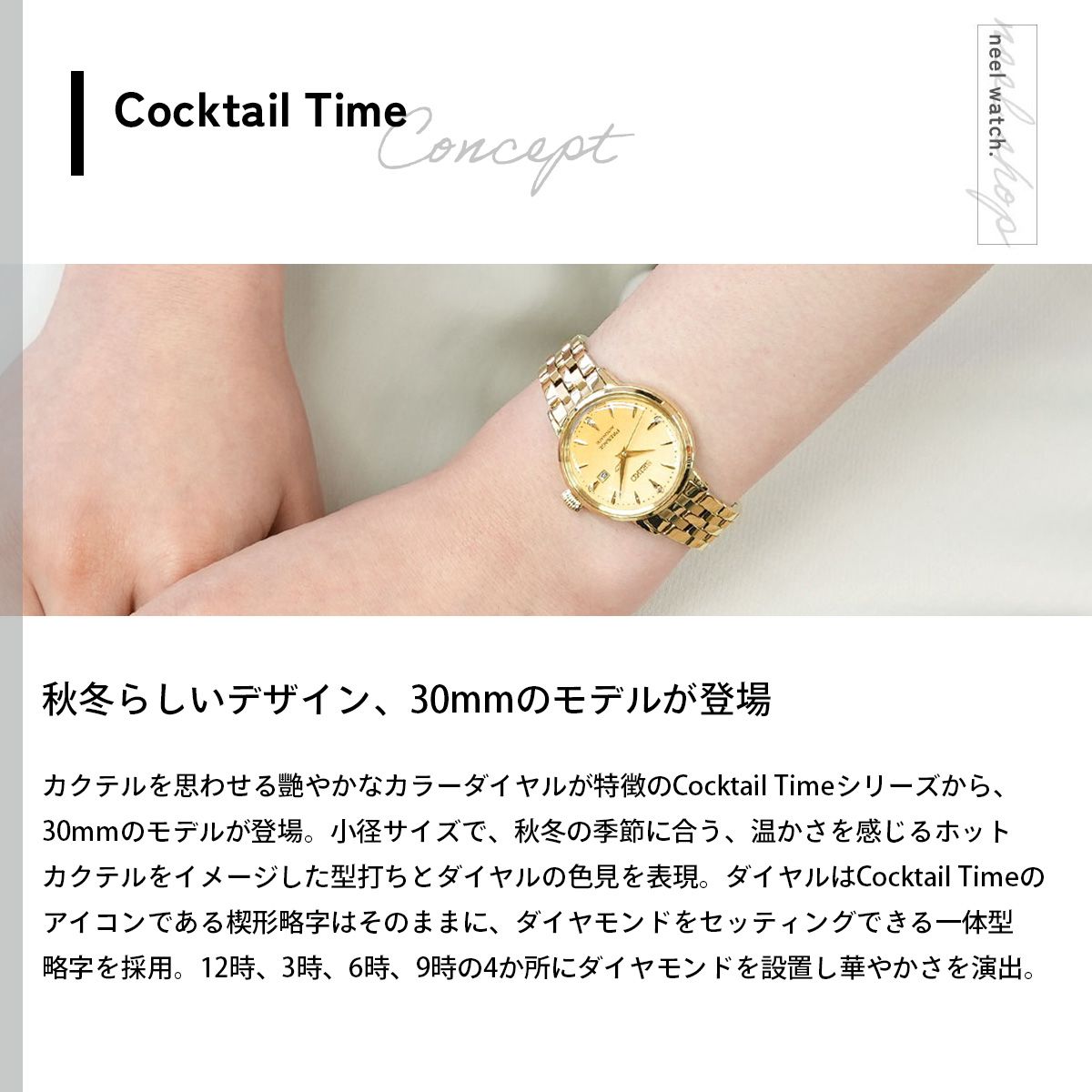 カクテルを思わせる艷やかなカラーダイヤルが特徴のCocktail Timeシリーズから、秋冬らしいホットカクテルをイメージした30mmのモデルが登場。30mmの小径サイズで、秋冬の季節に合う、温かさを感じるホットカクテルをイメージした型打ちとダイヤルの色見を表現。ダイヤルはCocktail Timeのアイコンである楔形略字はそのままにダイヤモンドをセッティングできる一体型略字を採用。12時、3時、6時、9時の4か所にダイヤモンドを設置し華やかさを演出。