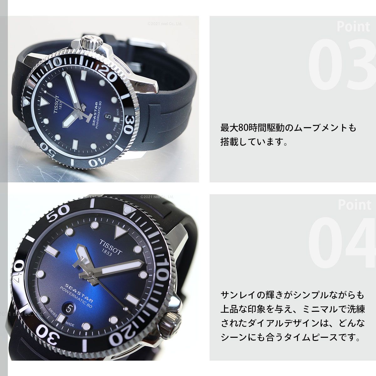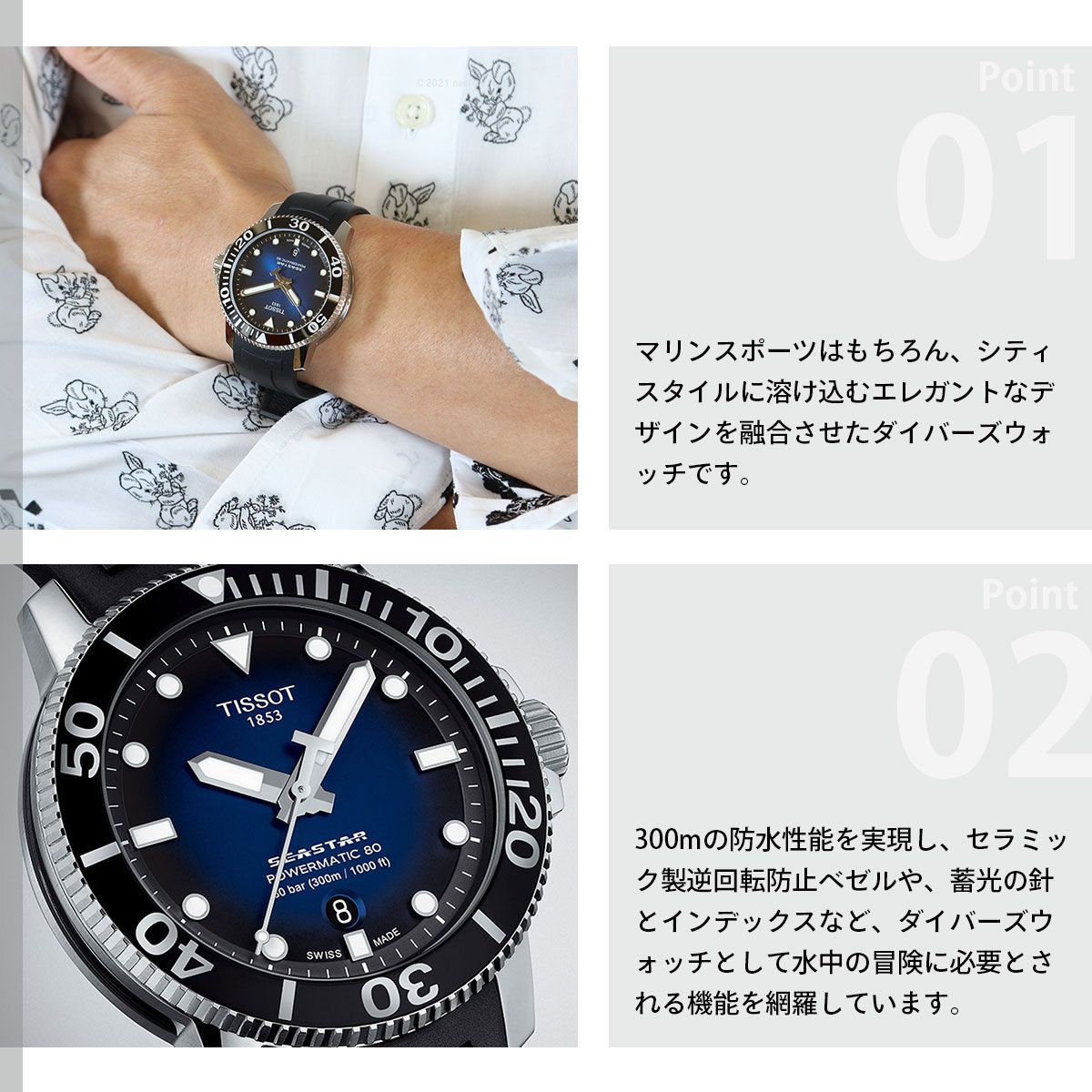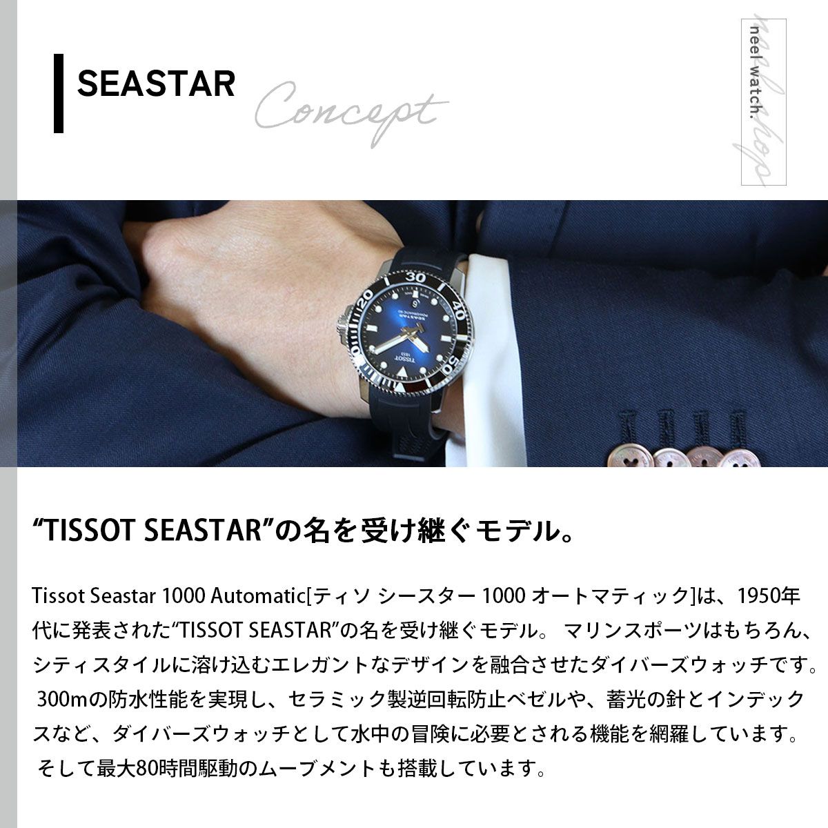 Tissot Seastar 1000 Automatic[ティソ シースター 1000 オートマティック]は、1950年代に発表された“TISSOT SEASTAR”の名を受け継ぐモデル。 マリンスポーツはもちろん、シティスタイルに溶け込むエレガントなデザインを融合させたダイバーズウォッチです。 300mの防水性能を実現し、セラミック製逆回転防止べゼルや、蓄光の針とインデックスなど、ダイバーズウォッチとして水中の冒険に必要とされる機能を網羅しています。 そして最大80時間駆動のムーブメントも搭載しています。 サンレイの輝きがシンプルながらも上品な印象を与え、ミニマルで洗練されたダイアルデザインは、どんなシーンにも合うタイムピースです。