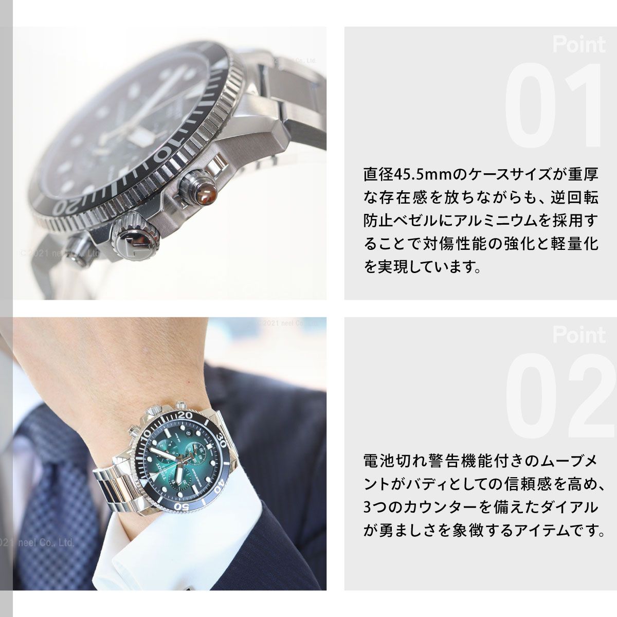 高い防水性を実現し、シティスタイルに溶け込むエレガントなデザインを融合したトータルバランスに優れたダイバーズウォッチ。クロノグラフモデルは30気圧防水を実装。直径45.5mmのケースサイズが重厚な存在感を放ちながらも、逆回転防止ベゼルにアルミニウムを採用することで対傷性能の強化と軽量化を実現しています。電池切れ警告機能付きのムーブメントがバディとしての信頼感を高め、3つのカウンターを備えたダイアルが勇ましさを象徴するアイテムです。