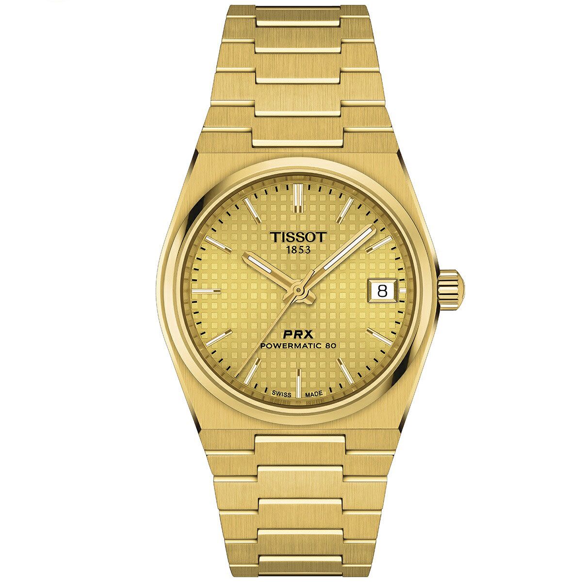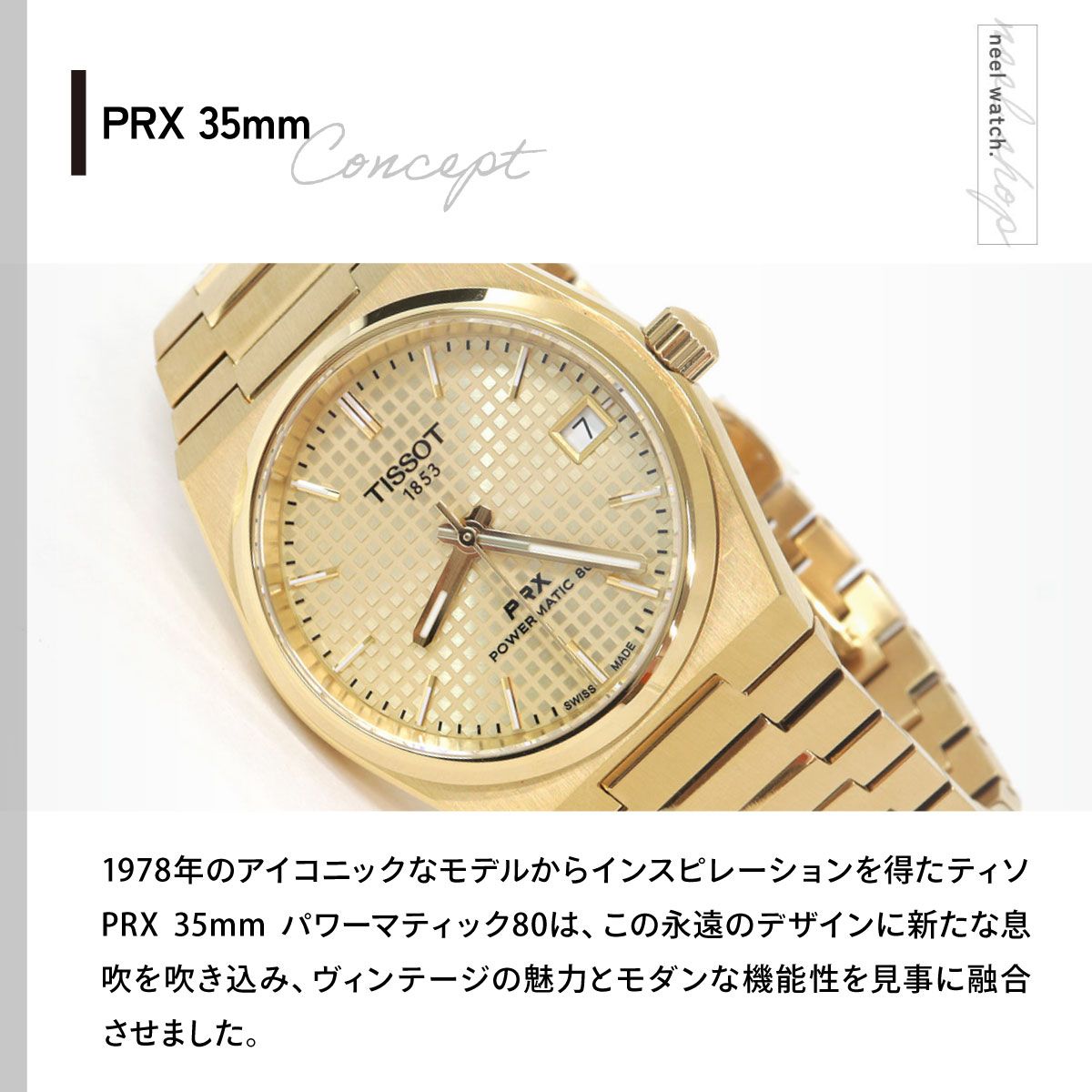 1978年のアイコニックなモデルからインスピレーションを得たティソ PRX 35mm パワーマティック80は、この永遠のデザインに新たな息吹を吹き込み、ヴィンテージの魅力とモダンな機能性を見事に融合させました。PRXの元となったモデルのオリジナルのケースサイズを再び採用し、新たに自動巻きムーブメントを搭載することにより、ティソはそのルーツに忠実なままの形で、ラインナップを拡充します。ティソ PRX 35mm パワーマティック80は、単なる時計ではありません。これは70年代後半のエッセンスを体現したステートメントピースです。その洗練された曲線とパイオニア精神は、クラシックウォッチの魅力を好まれる方にとって欠かせない、紛れもないスタイルアイコンです。あらゆる手首に対応する自動巻きの多機能ウォッチ ティソ PRX 35mm パワーマティック80は、その適応性の高さと普遍的な魅力によって、ドレッシーなシーンからカジュアルなシーンまで、どんなスタイルにもぴったりなタイムピースです。高級感あふれる仕上げと完璧な品質により、常に高級感のある見た目と風合いを演出します。エンボスド・チェッカード・パターンの文字盤が特徴的なこの自動巻きモデルは、クォーツモデルと一線を画し、この特別な時計にユニークなタッチを加えています。