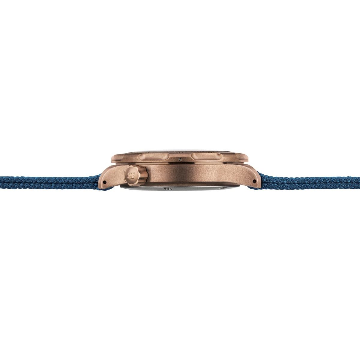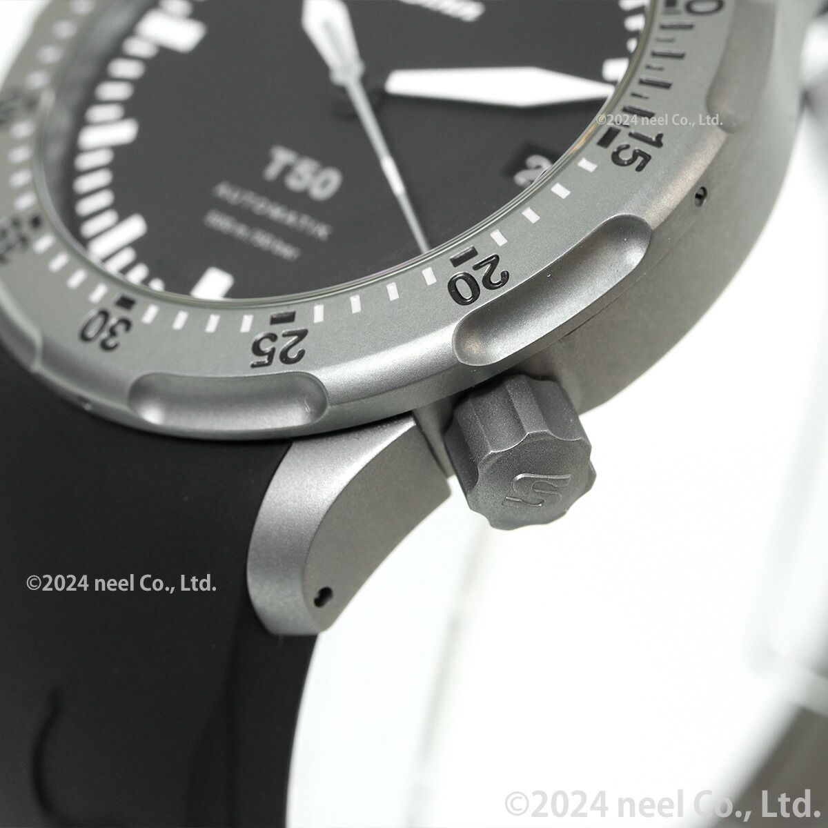 力強いデザイン性と高い操作信頼性をコンセプトに製作したT50は、ダイビングを安全に快適に行えるよう様々な点に配慮して設計されています。 特徴のひとつは特殊結合方式で固定したセイフティーダイバーベゼルで、不意の衝撃でも外れることがなく、意図せず回転してしまうことがないように、押して回さなければ回転しない誤回転防止構造を持っています。このベゼルはテギメント加工によりセラミックと同等の硬度で高い耐傷性を誇ります。 必要最小限に絞り込んだダイヤル表示は、時間の明確な読み取りと計測を徹底的に追求しています。夜光カラーは色分けをし、暗所や視認性の悪い状況下でも設定時間を確実に読み取れるよう、時針とダイヤル上のインデックスはグリーンに、分針と秒針、そして回転ベゼルのメインマークはブルーに発光します。さらに比重が軽くアレルギーを起こしにくい高強度チタン製ケースは、リューズを4時位置に配置して装着感を高めています。