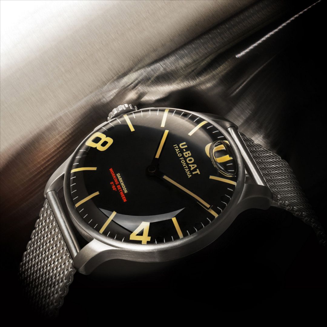 戦闘用プロフェッショナルウォッチをルーツに持つU-BOAT。この「ダークムーン」は、風防内にオイルを注入することでダイヤルが文字盤と一体化したかのような視覚効果をもたらすと共に、抜群の視認性を実現しています。「ダークムーン」の名の通り、暗い月の色彩にインスパイアされたダイヤルデザイン。