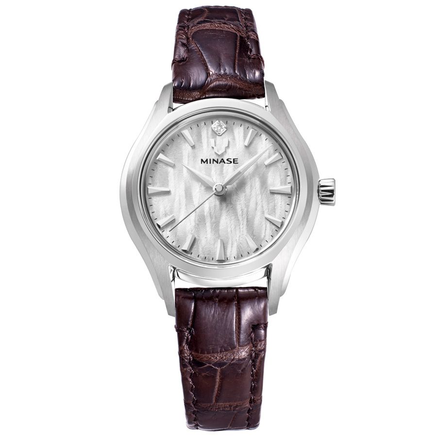 Luna Archは、シンプルで洗練されたフォルムに隠された立体感と曲線美が魅力のモデルです。サファイアガラスを上からホールドするデザインのベゼルはジュエリーの覆輪止めをイメージしており、高級感がありながらもベゼルとケースの間から見えるサファイアガラスの透明感により軽やかな印象を与えます。ダイヤルには皆瀬川の水面が乱反射する模様がデザインされており、どの角度から見ても上品な輝きを放ちます。日常使いはもちろん、特別な場にも相応しい一本です。