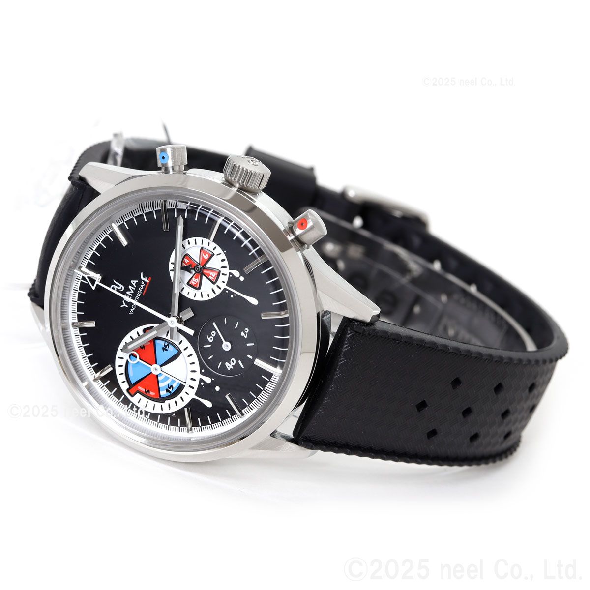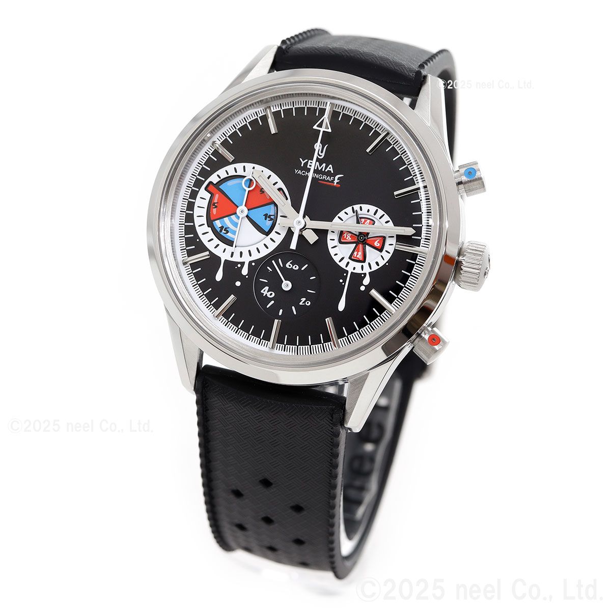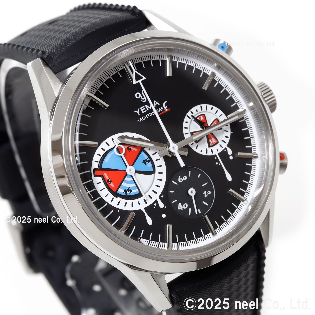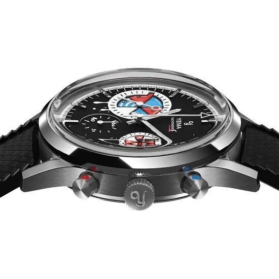 フランス・パリの時計アーティスト、ロマリック・アンドレ氏が率いるseconde/seconde/(セコンド/セコンド)とのコラボレーションモデル。1960年代の歴史的なセーリングクロノグラフが、業界で最も魅力的な『時計の破壊者』のキャンバスに生まれ変わりました。YEMAのヘリテージである『ビッグアイ』のヨッティングラフを、アナーキーでポップなデザインにリミックス。レース中にストリートアーティストに殴られたような文字盤と、小さなスプレー缶のキャップを思わせるクロノグラフプッシャーがユーモラスにその反骨精神を体現しています。裏蓋には『La Croisiere.ma muse』(クルーズ、私のミューズ)という締めのフレーズが刻印。これは70-80年代に放映されたアメリカのTVシリーズ「ラブボート」のフランス語タイトル『La Croisiere s’amuse』(クルーズは楽しい)をもじったものです。